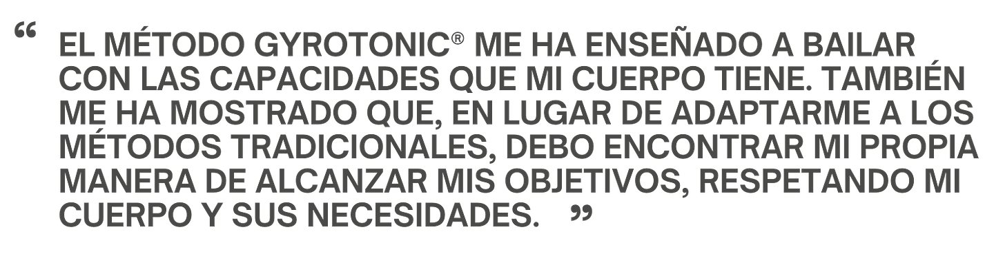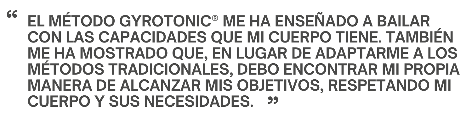 "Soy bailarina de ballet, y el GYROTONIC® me brindó la conciencia corporal que necesitaba en mi formación. Sin embargo, cuando mi entrenamiento se volvió más intenso, dejé de practicarlo. Luego, sufrí una lesión grave en las vértebras que no solo me impidió bailar, sino también realizar actividades cotidianas. Cuando me dijeron que debía dejar de bailar para recuperar mi espalda, decidí reconectar con el método. En ese momento, comprendí que quería convertirme en instructora, tanto para sanar mi cuerpo como para ayudar a otros."